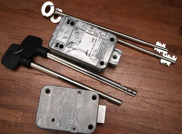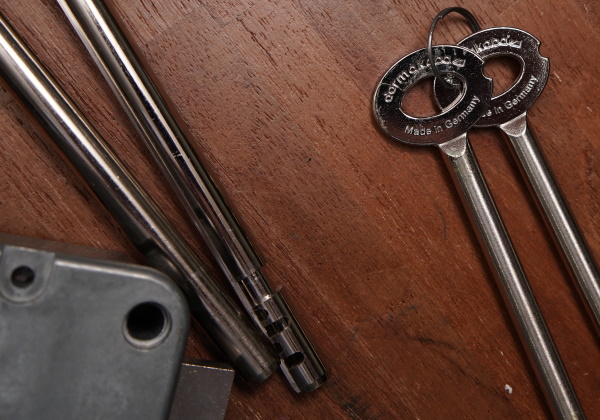 - 葉片式鑰匙鎖 (Lever Lock): 葉片式鑰匙鎖由數片銅製彈簧片組成。其鑰匙外觀非常一致,通常是長柄狀,鎖頭末端有多個齒痕。葉片數越多,安全性越高。為了提升防盜效果,鑰匙也分單面、雙面,甚至中空設計。與銅珠式鎖不同,葉片式鎖的鎖芯是安裝在保險櫃鋼板的後方,並有專用底座穩固。這使得鎖芯受到鋼板的嚴密保護,大大增加了破解難度。由於其複雜結構與高安全性,這類鎖具的成本也相對較高,通常用於要求高規格防護的頂級保險櫃。